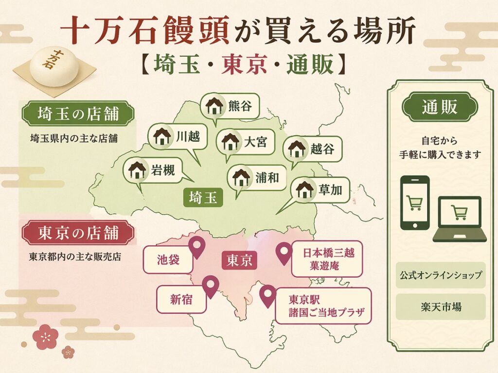 十万石饅頭のメインの購入場所は、やはり埼玉県内の直営店です。行田市の本店をはじめ、大宮・浦和・川越・草加・越谷など埼玉の主要エリアに複数の店舗が展開されており、毎日新鮮な状態で購入できます。