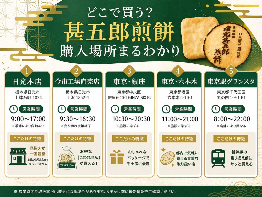 日光甚五郎煎餅を「どこで買えるのか」気になっていませんか?日光観光のお土産として長年愛されているこの煎餅、実は日光以外でも買える場所がいくつかあります。でも「せっかく行ったのに売り切れだった」「東京でも手に入るって本当?」と不安になる方も多いはず。