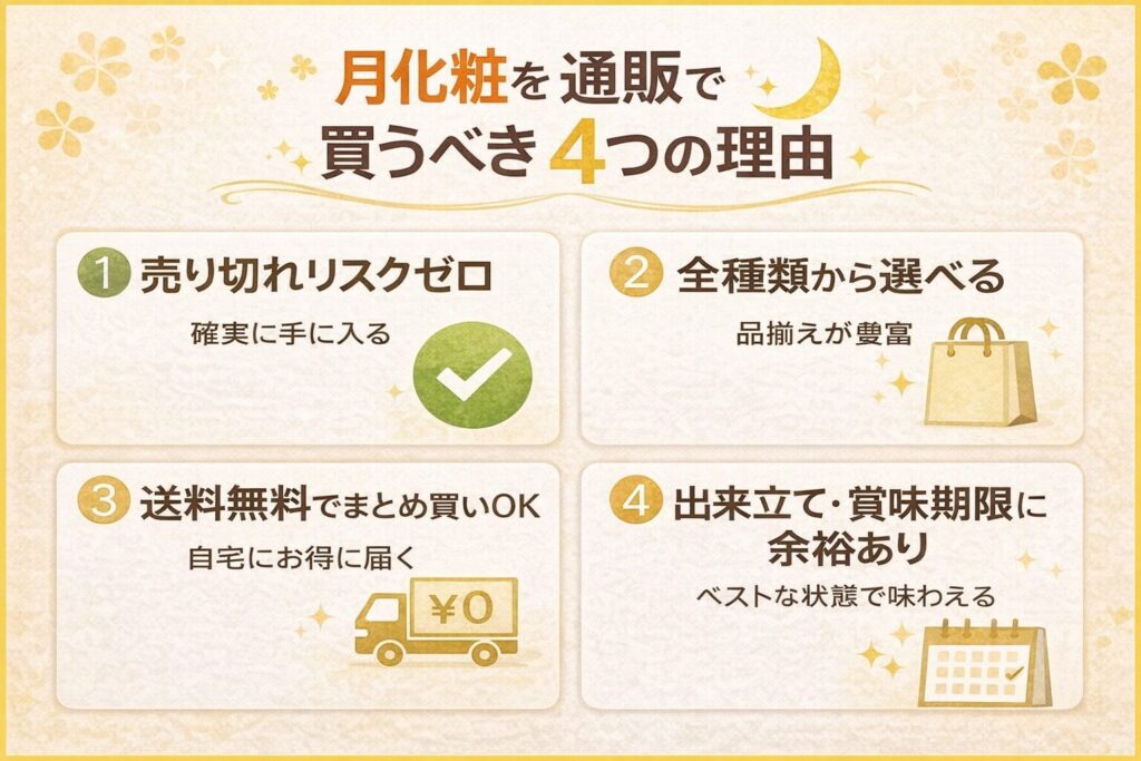 ここまで実店舗情報をまとめましたが、正直に言います。「手間をかけず確実に手に入れる」なら、通販が最強です。 理由は4つあります。