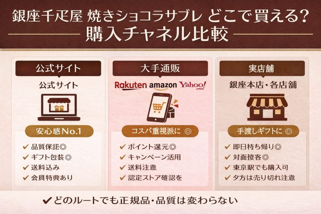 銀座焼きショコラサブレは、公式オンラインショップ・大手通販サイト・実店舗の3ルートで購入できます。自分のシーンに合った購入先を選べば、後悔なく手に入れることができますよ。